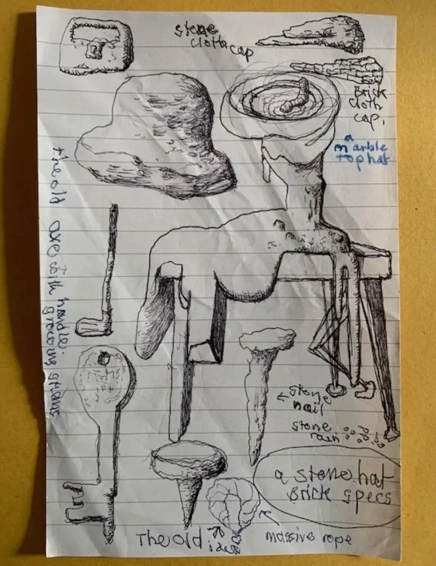 A design for ‘stone hat and brick specs’ from one of Jamie’s ideas folder